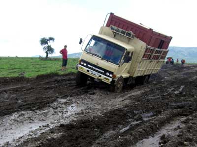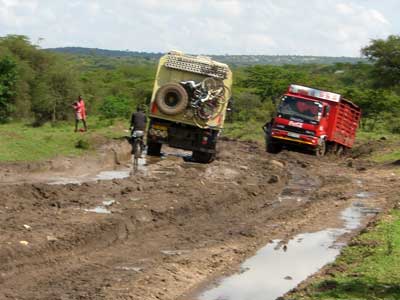 14 kilomètres en plus de 4 heures..sans s'embourber. Vive l'Afrique sous la pluie