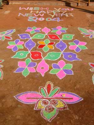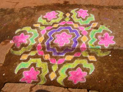 de dessins à la craie devant les maisons, les échoppes, les temples... |