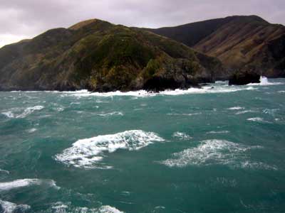 Nous sommes servis à notre entrée dans le détroit de Cook : force 8/9 et vague de 7 mètres de creux... ça bouge !!